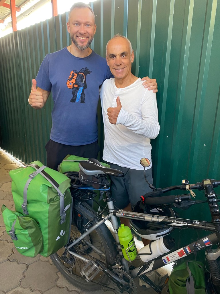A 8h pétantes, je donne mon premier coup de pédale. Je me sens en pleine forme après une nuit vraiment réparatrice. Jaslav, qui vient de découvrir l’autocollant de St Pétersbourg sur mon cadre, veut absolument faire une photo de nous deux. Il est né sur la fameuse île aux lapins et y réside toujours, ainsi que ses parents. Le grand gaillard est tout ému par mon histoire d’anniversaire de mariage.