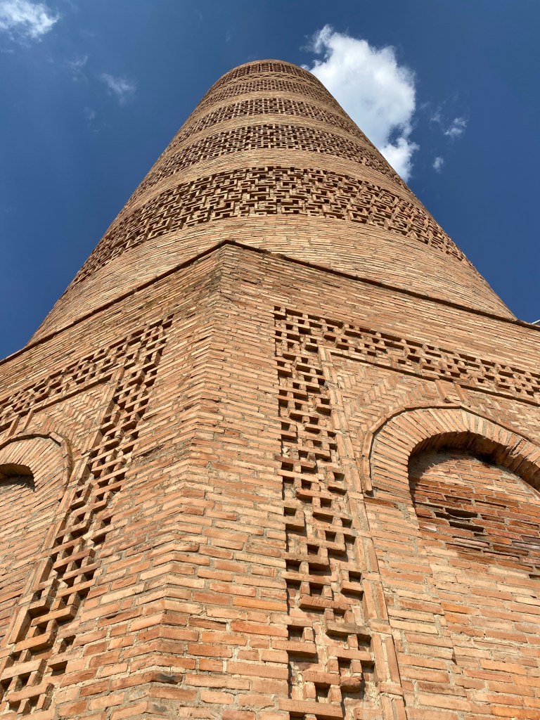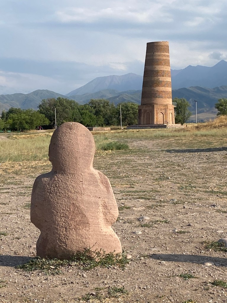 J’arrive à Burana vers 17h, ce qui me laisse le temps de visiter le site. La fameuse tour est un minaret du 11ème siècle, seul vestige d’une vaste cité disparue, autrefois capitale de l’état de Karakhand sous le joli nom de Balasagun. On a retrouvé là les vestiges d’un palais, d’une mosquée, de trois cimetières, de pierres gravées et de nombreuses habitations. Seul subsiste le minaret en brique, et encore ne mesure-t-il plus que 24 mètres de haut, contre 46 à l’origine. C’est le seul debout dans toute l’Asie centrale. Avec beaucoup de gentillesse, la gardienne du musée m’explique tout cela dans un anglais, disons, très slave. Je flâne assez longtemps sur le site, sous un soleil de retour après des périodes bien nuageuses.