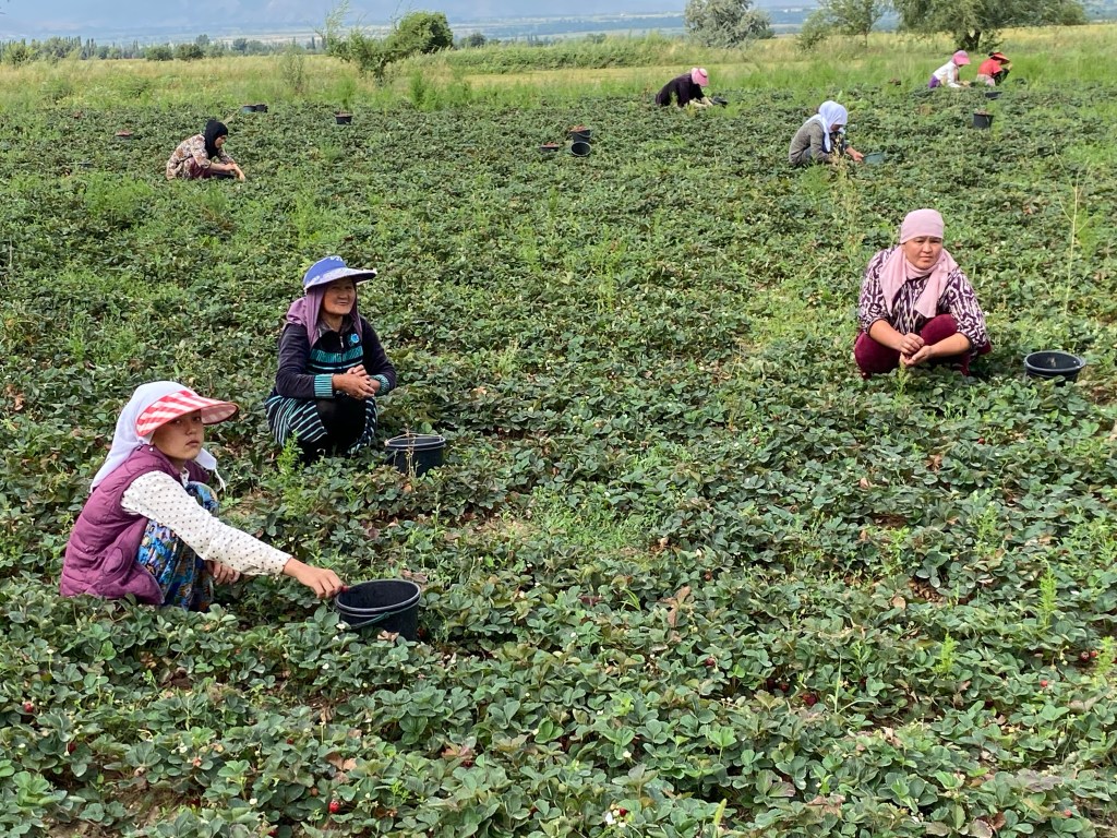 Le long des petites routes que j’emprunte au début, les agriculteurs s’affairent. Cette vallée de la Chuy est l’un des deux greniers du pays. L’autre est la vallée de Ferghana, au sud-ouest. Ce matin, la cueillette des fraises bat son plein. Je demande l’autorisation de photographier les femmes au travail, mais certaines sont réticentes; je n’insiste pas. Le patron, tranquillement assis à l’ombre, compte les seaux rapportés par les cueilleuses. En France il connaît Paris et … Toulouse !