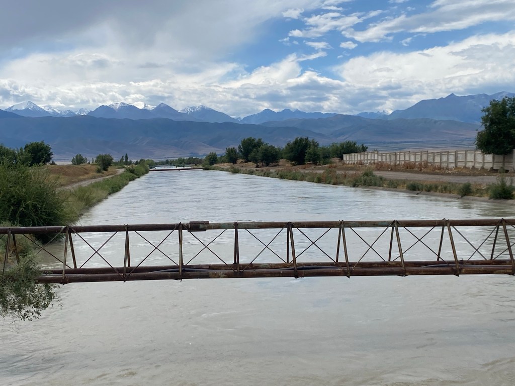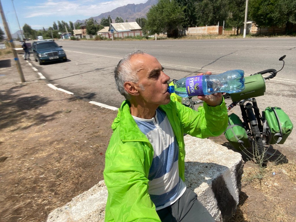A partir de Kemin, la route descend un peu et s’oriente vers le sud, ce qui rend le vent d’est moins gênant. Les carrefours sont rares, mais remarquables ; chaque intersection est un lieu de vie et d’activité : on y vend des pastèques, du pain, des fruits ou encore des épis de maïs bouillis; des voyageurs guettent l’arrivée de leur marshrutka, les minibus très populaires ici, d’autres lèvent le pouce ( l’autostop est une institution pratiquée par tous, surtout les femmes), d’autres enfin regardent simplement toute cette agitation.