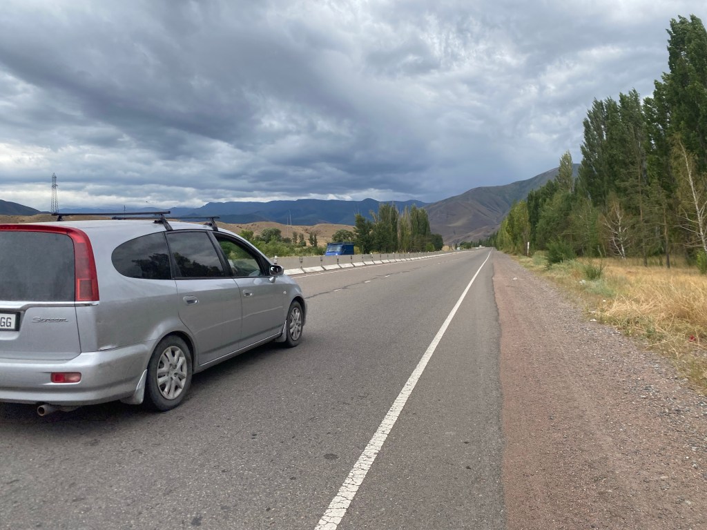 Une grosse averse orageuse m’oblige à m’abriter sous un abribus avant de prendre la grande route vers l’est, direction Kemin. Si le soleil revient, le vent se lève aussi; il est de face, évidemment et ne cesse de se renforcer. Tant et si bien que le 30 kilomètres jusqu’à Kemin seront très pénibles sur cette nationale très fréquentée et toute droite. Elle compte environ quatre files, ce qui permet de rouler à cinq de front, vu qu’on double aussi bien par la droite que par la gauche…