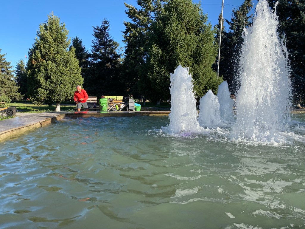 Quand je dors dans un parc public en ville, j’aime bien décaniller de bonne heure. Ce sera le cas aujourd’hui, puisque à 6h il n’y a plus aucune trace de mon bivouac. Et le lieu est plus propre que la veille. Je m’installe petit-déjeuner sur un banc, face à une grande fontaine publique. Le soleil vient réchauffer mes vieux os et surtout recharger ma batterie.