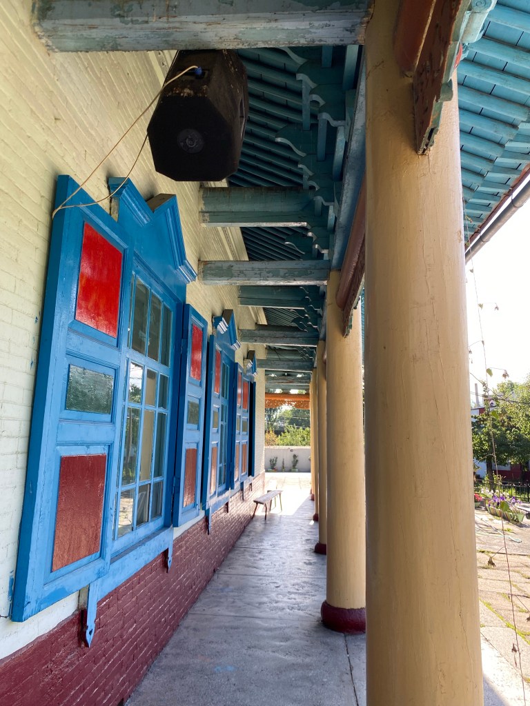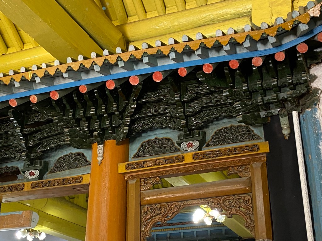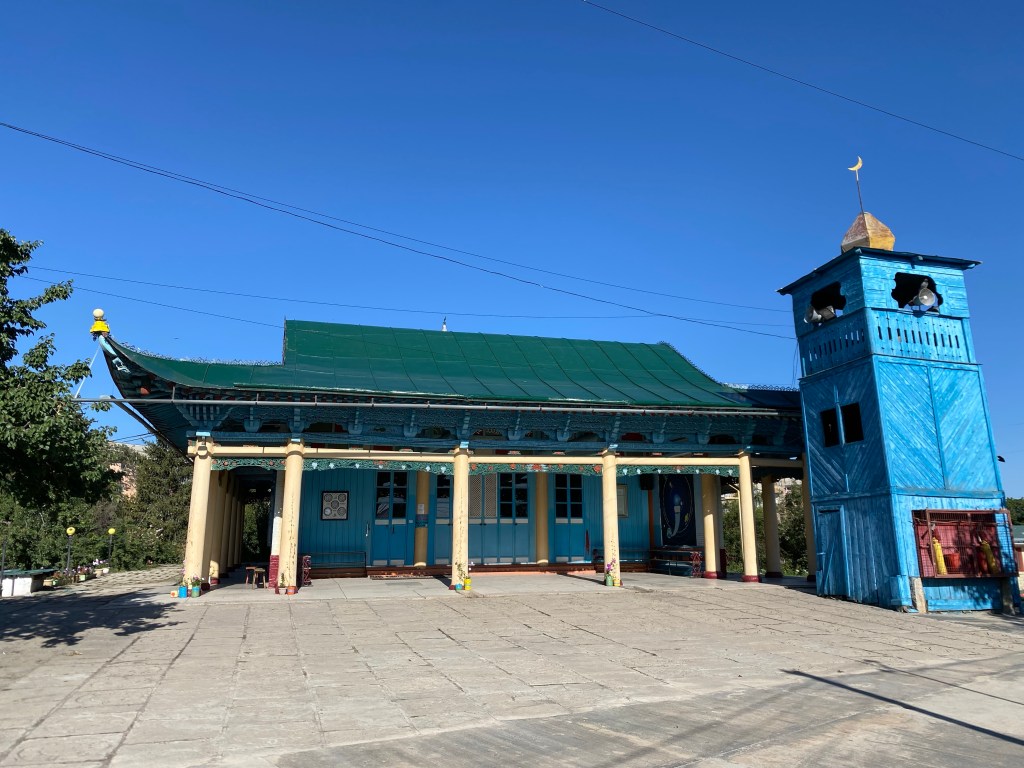 Il me reste une curiosité de Karakol à découvrir, la mosquée chinoise. Allah seul sait pourquoi, au début du xxème siècle, les musulmans de la ville ont fait appel aux services d’un architecte chinois pour construire leur nouvelle mosquée. Celui-ci s’est exécuté en respectant les règles islamiques, mais à sa manière. Le résultat est un hybride entre temple bouddhiste et mosquée. C’est coloré, plein de charme et sans doute unique au monde. S’il n’y avait le minaret en bois bleu planté à côté du bâtiment, rien n’indiquerait de l’extérieur qu’il s’agit d’une mosquée. L’intérieur est aménagé selon le rite islamique, mais la décoration est très chinoise. Étonnant mélange ! Plus étonnant encore, ce bâtiment tout en bois tient debout sans une vis ni un clou ! (qualité attribuée hier par erreur à l’église orthodoxe. Mea culpa). Toute la subtilité tient dans l’assemblage des pièces de bois, une technique héritée d’une longue tradition en Chine. D’ailleurs, l’architecte fut condamné pour avoir livré les secrets de ses techniques à des musulmans. Dernière caractéristique étonnante, la mosquée est antisismique, grâce à des fondations flottantes.