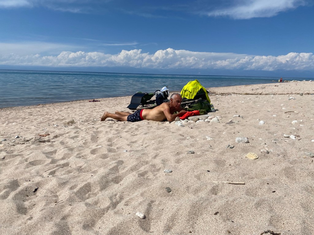 Je me donne pour objectif d’effectuer au moins 50 kilomètres avant de m’arrêter déjeuner. Mais comme je me sens bien, et que le lac approche, je pousse jusqu’à trouver une plage accueillante. Ce sera vers le kilomètre 70. Colibri couché dans le sable, j’enfile le maillot de bain et je me jette dans l’eau toujours aussi agréable du « lac chaud ». Située hors agglomération, la plage est quasi déserte. J’y passe une bonne heure et demie avec trois bains et un gros pique-nique à la clé.
