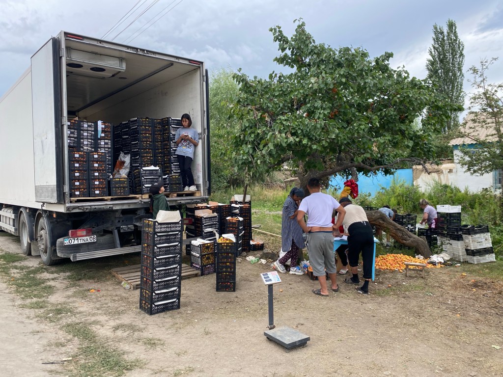 Il me reste une quinzaine de kilomètres jusqu’à Barskoon, et je suis étonné par le grand nombre de semi-remorques stationnés à la queuleuleu sur le bord de la route, portes arrières grand ouvertes. A force d’observer, je comprends qu’ils attendent les chargements d’abricots, fruit de la cueillette du jour chez les nombreux petits producteurs. Une balance, un registre et on embarque les cageots. Tout cela se fait en famille, les enfants mettant la main à la pâte.