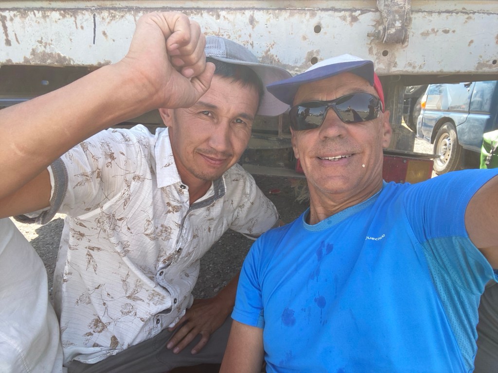 Je retrouve ainsi un peu de vigueur pour affronter cette route, toujours aussi rectiligne et en léger faux plat montant. Ce pensum ne sera interrompu que par quelques épisodes agréables, tels que la rencontre avec une équipe de marchands de pastèques qui attendent leurs clients. À l’ombre des petits pick-up Hyundai, on partage une pastèque bien mûre et on se prend en photo mutuellement. Et puis il y a la course à la flotte; chaque point d’eau repéré sur le bord de route me permet de m’asperger abondamment et, quand la source est fiable, de remplir mes bidons. Dans les deux cas l’effet est de courte durée; la casquette et le t-shirt trempés sèchent en cinq minutes. Quant aux bidons, ils sont rapidement vidés pour étancher ma soif. Je pense que je bois plus de dix litres par jour.