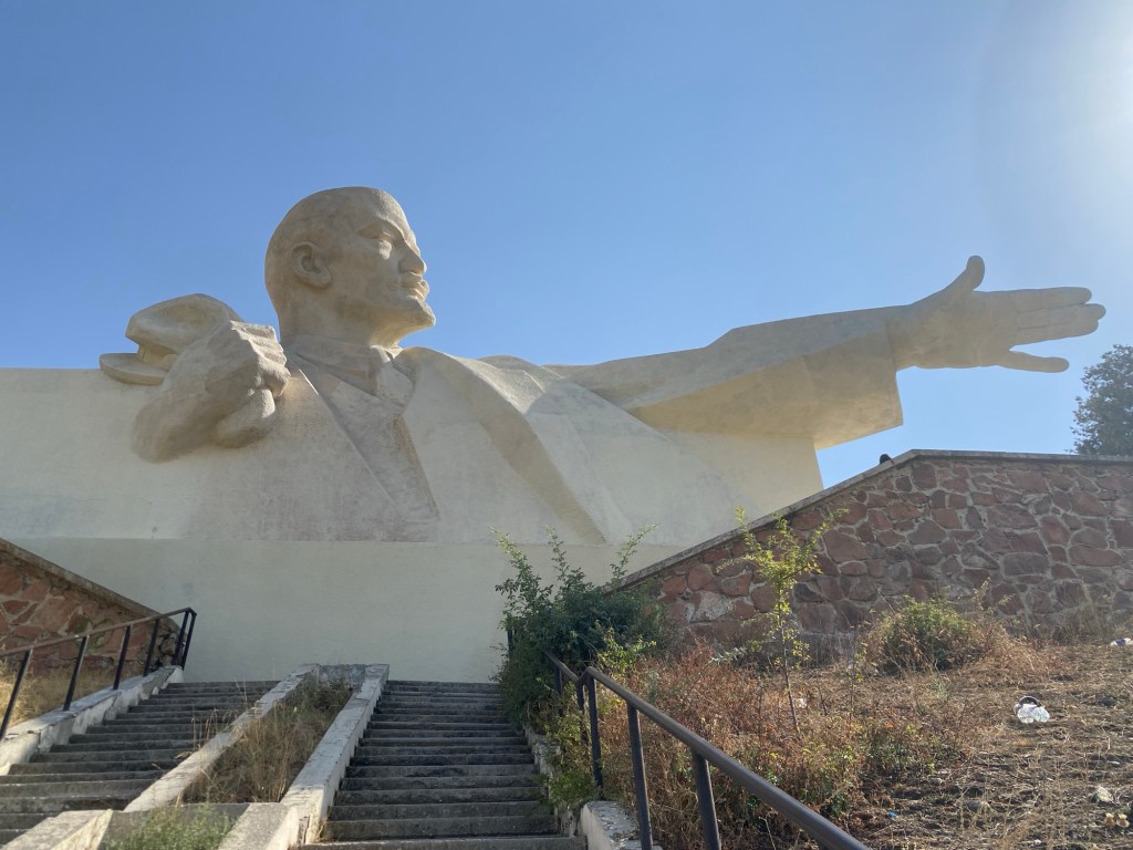 Dans un tout autre genre, j’ai repéré à proximité un monument spectaculaire à la gloire de Lénine. Comme il est situé sur la rive d’un lac, je me dis que je peux faire d’un détour deux coups : visiter et bivouaquer au bord de l’eau. La première partie du projet mérite à elle seule le détour. Le buste hiératique du père de la Révolution mesure au moins 15 mètres de haut et 20 mètres de long. Comme toujours, sa main tendue montre le chemin à suivre. Cette fois elle est orientée vers l’ouest, ce qui pourrait être interprété comme une menace…