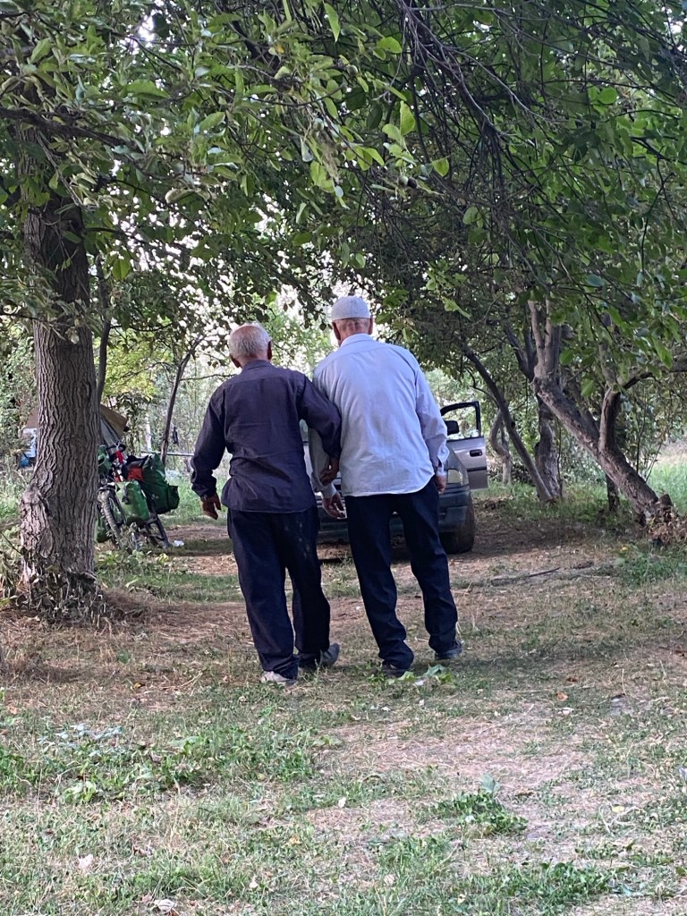 En revanche, j’abandonne vite l’idée de camper au bord du lac, dont les rives sont soit abruptes, soit desséchées. Je me rabats donc sur les jolis petits jardins bien arborés aperçus sur mon passage à l’aller. J’en choisis un particulièrement bien ombragé et je me présente au propriétaire, allongé sur un châlit avec un copain, très occupés à grignoter en sirotant de la vodka. Je suis aussitôt invité à me joindre à eux, y compris pour la vodka. Mon refus initial ne résiste pas longtemps à l’insistance des deux compères et en moins de dix minutes je contribue à finir la bouteille, réussissant ainsi brillamment le rite initiatique préalable à toute discussion. Le buffet improvisé se garnit de tomates, courgettes, oignons, saucisson et autres morceaux de viande bien gras.