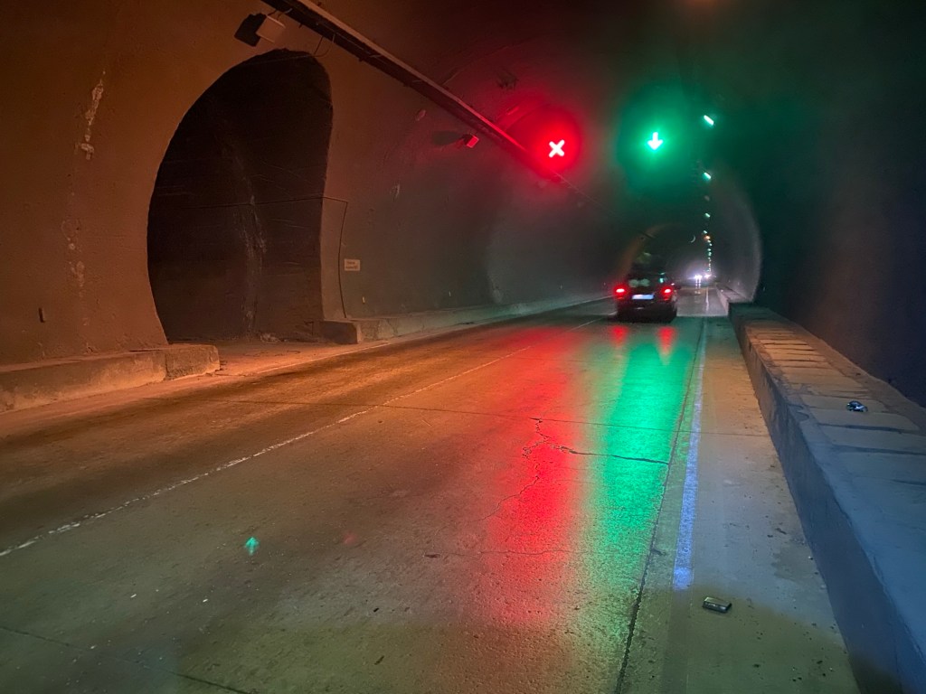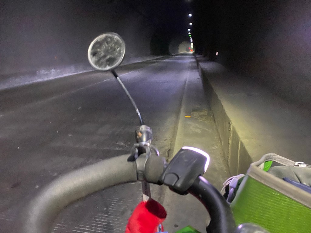 Je reprends tranquillement la route M34 qui continue de monter gentiment. Je me fixe un rythme de pauses tous les 5 kilomètres. Je ne m’y tiendrai pas du tout et je fais 10 bornes avant de poser pied à terre. Au Km 15, je m’arrête de nouveau face à un nouvel obstacle, un tunnel. Je savais que cette route en comporte au moins trois, mais je ne me souvenais pas que le premier arrivait aussi tôt. Je guette avec anxiété l’arrivée d’un garde qui m’interdirait le passage, mais le seul que j’aperçois semble totalement indifférent à ma présence. Je m’équipe donc en conséquence avec gilet jaune, une lampe rouge sur le casque, une autre sur le porte-bagages, une lampe de guidon et la frontale. Ainsi harnaché, je m’engage dans la gueule du monstre. Comme l’un des deux tunnels est en travaux, l’autre sert à la circulation dans les deux sens, ce qui rend l’exercice encore plus périlleux. Un œil sur la ligne blanche qui délimite une simili bande d’arrêt d’urgence, l’autre dans le rétroviseur, j’avance prudemment dans le noir. Mon principal souci est de repérer les voitures qui roulent dans le même sens que moi, afin de m’arrêter pour les laisser passer. Mais je ne néglige pas non plus celles qui arrivent en face car certaines n’ont pas de lumière et d’autres entreprennent des dépassements incroyablement dangereux dans ces conditions. Certaines portions sont faiblement éclairées par des lampes jaunes, d’autres sont totalement plongées dans le noir. Je fais aussi quelques pauses dans les espaces dédiés aux véhicules en panne.