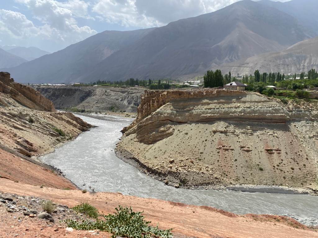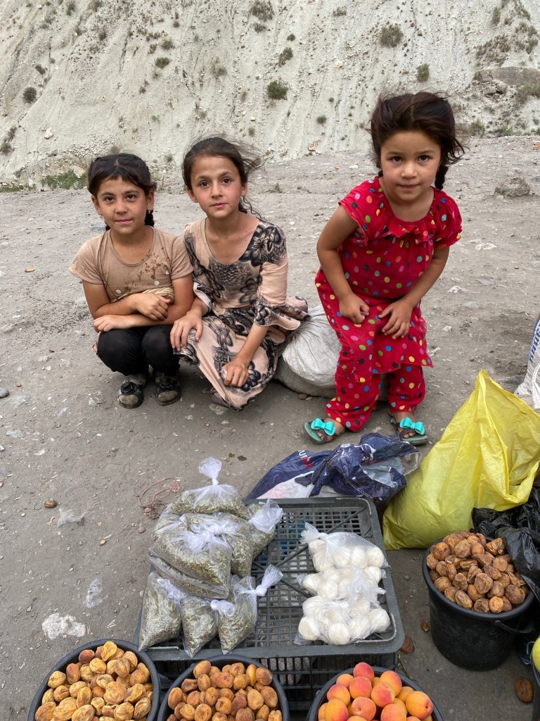 A la sortie de la ville je mange deux chachliks et deux samoussas; ces derniers sont si bons que j’en emporte trois pour mon dîner. La route s’enfonce ensuite dans des gorges assez impressionnantes, en remontant le cours de la rivière Fon. Les montées et les descentes se succèdent, toujours sur un revêtement impeccable, ce qui me facilite la tâche. Je m’arrête de temps à autre pour photographier ces montagnes aussi arides que grandioses ou récupérer de l’eau à une des nombreuses sources. Je fais aussi une halte pour acheter des abricots à trois adorables gamines. Le plus difficile est de leur faire comprendre que je ne veux pas le seau de 1,5 kilo, mais seulement une dizaine de fruits.