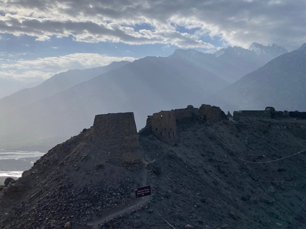 À 6h, je suis le premier et le seul client des sources chaudes, ce qui me permet d’en profiter au maximum et de faire des photos et vidéos. Comme hier, il me faut quelques instants avant de parvenir à me mettre entièrement dans l’eau à 43 degrés mais ensuite c’est un vrai plaisir, et un grand délassement. À la sortie, Zorro, c’est le nom du gardien, m’offre un thé que j’accompagne avec du pain, du miel et des gaufrettes pour en faire mon petit déjeuner. Il me faut ensuite redescendre les 7 km de chemin en passant à côté de la forteresse de Yamshum.