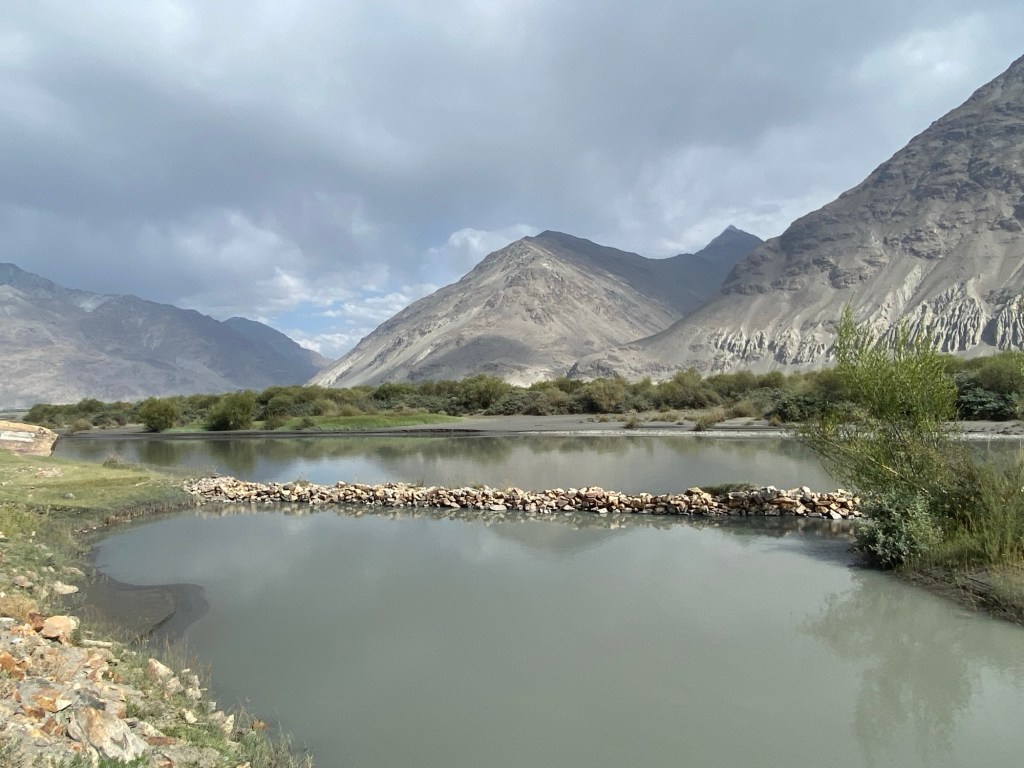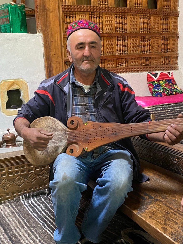 Heureusement, cette route est émaillée de sites à visiter. C’est ainsi que je m’arrête à un endroit indiqué calendrier de pierre. En fait il s’agit d’un musée des traditions de la vallée de Wakhan. J’ai la chance d’arriver en même temps qu’une famille polonaise, si bien que j’ai droit à la visite guidée. Je retrouve la maison traditionnelle pamiri, dont j’apprends qu’elle comporte aussi des éléments symboliques liés au zoroastrisme, la religion qui prévalait dans le pays avant l’arrivée de l’islam au huitième siècle. Le guide nous montre sa collection d’outils agraires et de parchemins enluminés. Et on a aussi droit à un petit concert de musique sur des instruments traditionnels anciens, utilisés notamment par les soufis, nombreux dans la région.