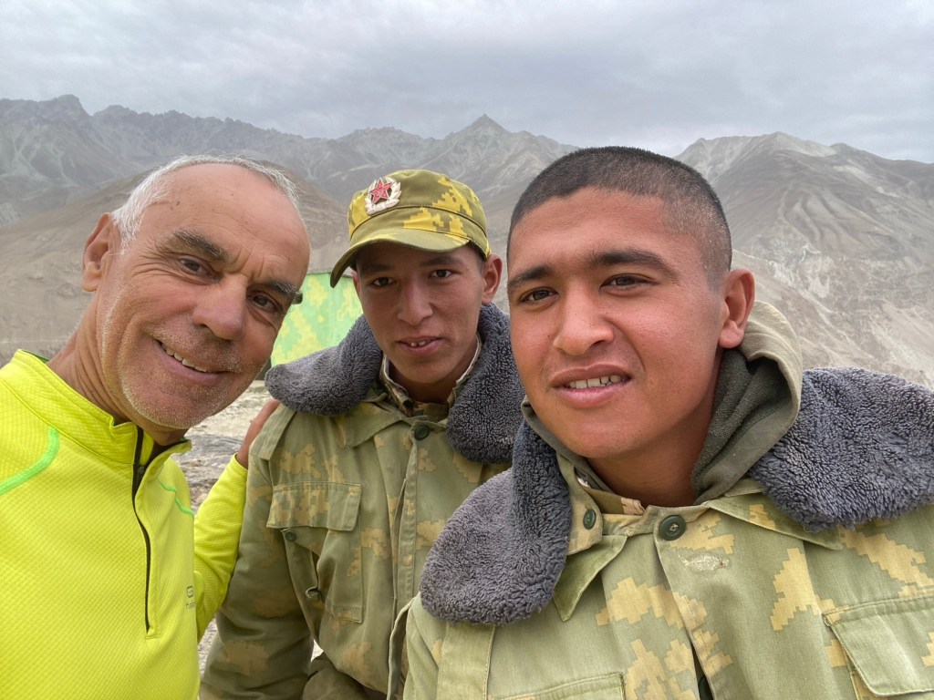 En attendant qu’il vienne me chercher, je discute avec deux soldats tadjiks qui surveillent la frontière afghane. Ils m’expliquent que cette surveillance n’est pas liée à l’arrivée des Talibans au pouvoir, elle a débuté dès l’indépendance du pays en 1991, bien qu’il n’y ait aucun conflit ouvert entre les deux pays. Tous les hommes effectuent un service militaire de deux ans et le sergent se réjouit d’en avoir terminé dans six mois. Après un premier refus et amadoués par les pommes et les petits gâteaux que je leur offre, les deux soldats acceptent d’être pris en photo à condition qu’on ne voit pas leurs fusils sur l’image.