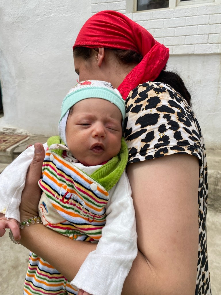 Ses trois filles, qui s’étaient montrées timide la veille, viennent spontanément vers moi dès qu’elles se réveillent. La plus jeune, Zoleikha, ne me quitte plus; elle me prend la main quand je me déplace en m’appelant « tourist » et elle m’aide à porter mes affaires. Elle me prend un peu pour son papy. Mais c’est la plus grande, Zainora, qui va me montrer le chemin du champ de pétroglyphes, qui est fameux et que je tiens à visiter. Après un long cheminement dans des minuscules venelles, elle me laisse en me montrant un chaos de rochers et repart dans l’autre sens, malgré mes demandes de m’attendre pour retrouver le chemin du retour.