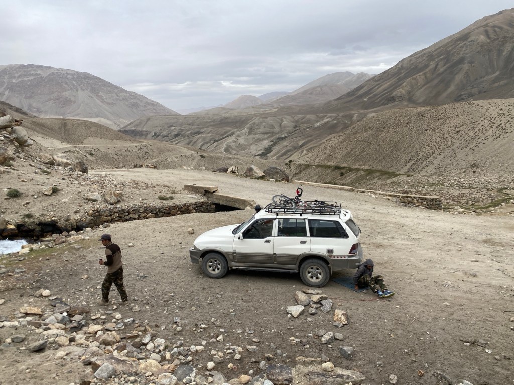 En roulant, je ne peux pas m’empêcher d’imaginer ce qu’auraient été mes difficultés sur ce trajet, et je suis tout simplement effaré de l’état de cette piste. D’abord, elle est souvent étroite, sinueuse, et elle présente tous les défauts et tous les pièges qui peuvent se présenter à un cycliste. À tous ceux que j’ai décrits les jours précédents, s’ajoute le franchissement de gués, dont certains ne peuvent être passés qu’après avoir déplacé des rochers qui barrent le passage. Tout cela dans un environnement extrêmement minéral et totalement dépourvu de toute trace de vie, au point que cela peut devenir angoissant. Pour toutes ces raisons, je me félicite d’avoir fait le choix du taxi pour cette portion. En outre, je profite du paysage et j’aperçois au passage quelques chameaux de bactriane, qui viennent boire sur l’autre rive de la rivière Pamir qui marque toujours la frontière avec l’Afghanistan.