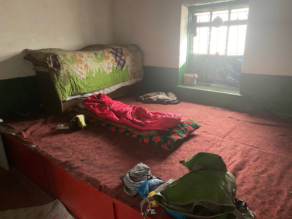 A 19h, je me glisse dans le duvet et m’endors après la lecture de quelques pages. Pas longtemps après, je suis réveillé par des bruits; on essaye d’ouvrir la porte que j’avais fermée de l’intérieur. Je me lève et la surprise est réciproque : quatre jeunes hommes me font comprendre qu’ils vont dormir ici. Dix minutes plus tard, le reste de l’équipe arrive en camion. En tout, c’est une douzaine d’hommes et enfants qui s’installent dans la maison. Je range le bazar que j’avais étalé partout, me croyant chez moi, et je partage l’estrade de la chambre avec deux gars, les autres s’entassant dans la cuisine.