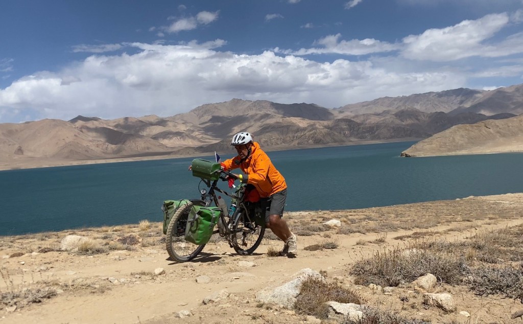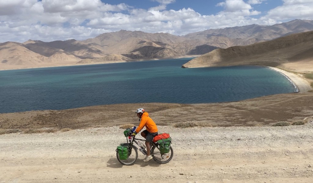 Contrairement aux trois 4×4 de touristes qui font demi-tour dès ce point de vue, j’entreprends de poursuivre la route qui surplombe le lac. Je bénéficie ainsi de vues différentes sur ce lieu exceptionnel. Sur le retour, je descends même jusqu’à une petite plage, imaginant un instant y installer mon bivouac. Mais je ne vois pas glander toute la journée à admirer le paysage. Et puis il y a ce vent d’Ouest permanent qui gâche le plaisir. La remontée se fait en poussant le vélo car la pente est très accentuée.