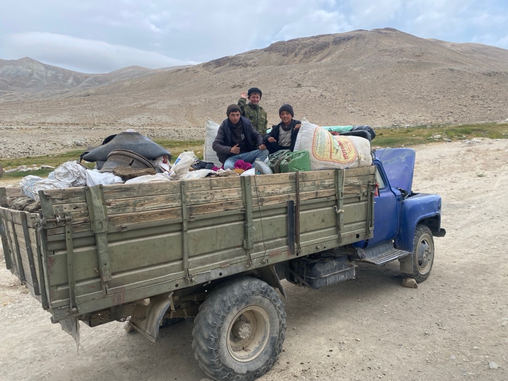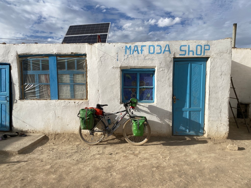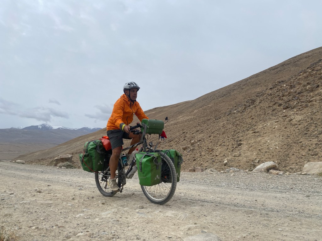 Après ces 20 km de descente plutôt pénibles, je suis tout heureux d’arriver sur la M 41, la fameuse Pamir Highway, mais je ne vais pas l’emprunter longtemps, tout au plus un petit kilomètre de montée avec le vent de face, avant de bifurquer à droite, en direction de mon objectif du jour, Bulunkul. Pour ceux qui ont regardé l’épisode des Routes de l’Impossible sur le Tadjikistan, Bulunkul est le point d’arrivée du camion qu’on suit tout au long de ce reportage. Cela m’a donné envie d’aller voir ce village perdu au bout du monde, tout proche d’un très joli lac, qui porte le même nom que le village.