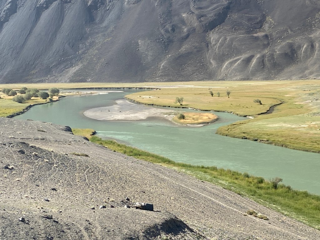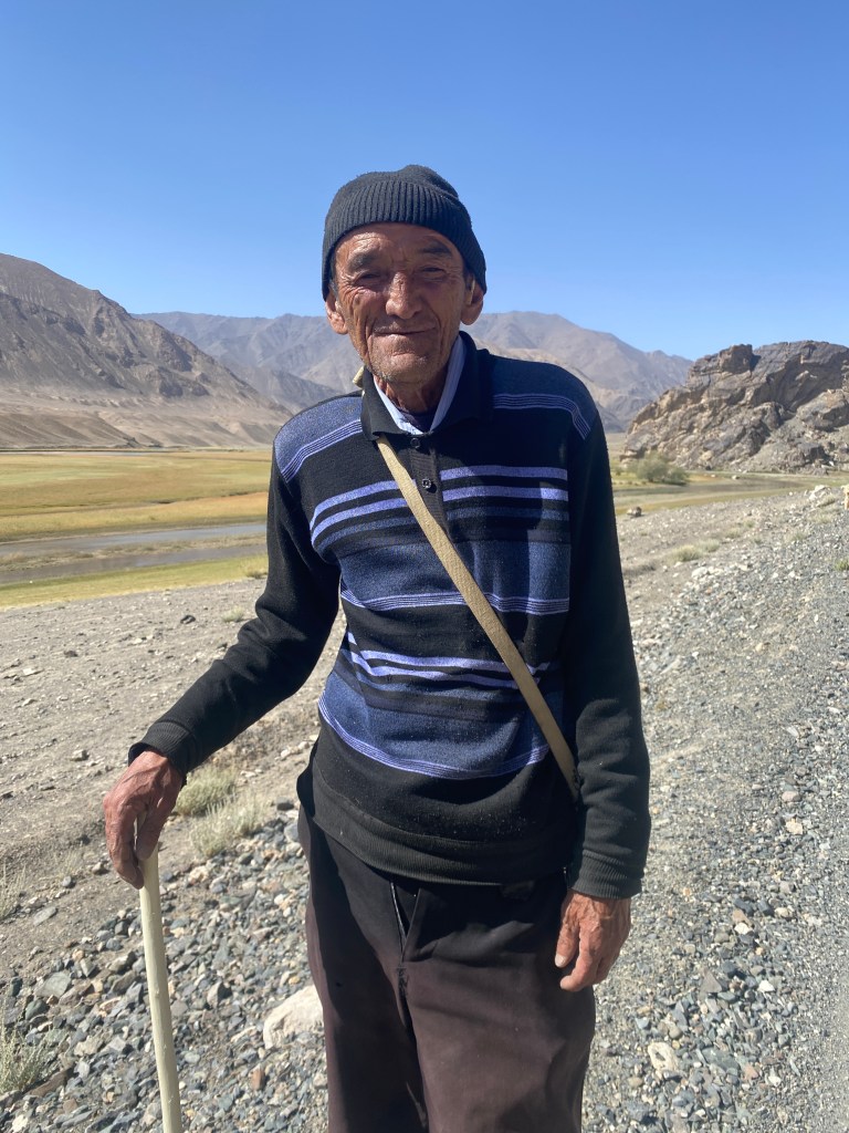 Vu dans l’autre sens, le paysage est évidemment un peu différent, mais tout aussi charmant, surtout sous les rayons obliques du soleil matinal. A l’approche de la maison où j’ai été accueilli hier, je vois les silhouettes de la mère et la fille sur le bord du chemin. On se salue chaleureusement, mais pas d’invitation, privilège réservé aux hommes. Le patriarche, je le croise un peu plus loin, de retour d’emmener ses bêtes à la pâture. Toujours aussi chaleureux, il garde ma main dans les siennes tandis que j’essaye de lui raconter ma nuit à Ak Tal. Il me propose le thé, mais je n’ai pas envie de faire demi-tour, alors il n’insiste pas et me libère avec un immense sourire et après avoir soigneusement refermé la fermeture éclair de ma veste.