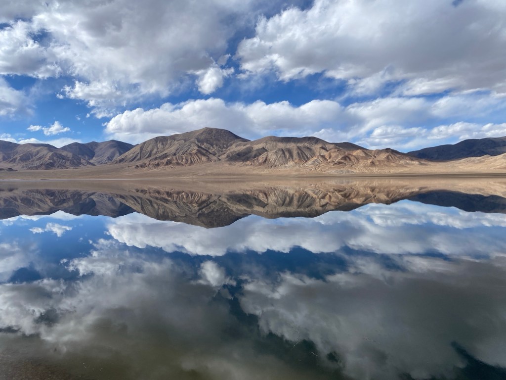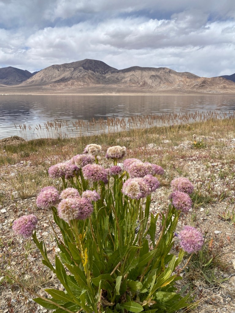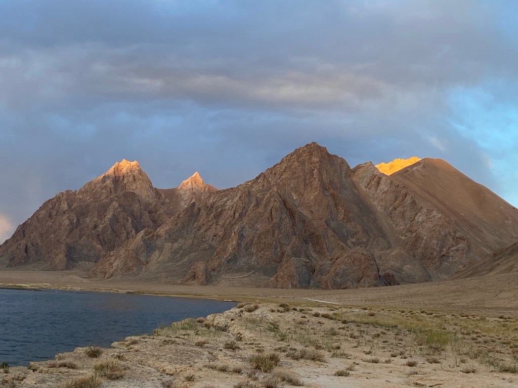 La piste qui mène à Rangkul est plutôt bonne hormis les trois premiers kilomètres. Je me fixe le kilomètre 40 pour faire la pause déjeuner. Et cela tombe bien car au kilomètre 40 j’atteins juste le premier des deux lacs, Shorkul. Petit, de forme ronde, il est sympa mais sans plus. Le casse-croûte avalé, je file donc vers le second, Rangkul, distant de quelques kilomètres seulement. Celui-ci est de forme allongée d’est en ouest, beaucoup plus majestueux et entouré de jolis monts. A l’est, des sommets enneigés à plus de 5.000 mètres sont en Chine. Je longe toute sa rive sud pour l’admirer, puis je reviens en arrière pour trouver un coin de bivouac. De toute façon, il ne sert à rien d’aller plus loin, le village de Rangkul, situé à dix kilomètres, marque le début de la zone interdite aux étrangers à cause de la proximité de la frontière chinoise.
