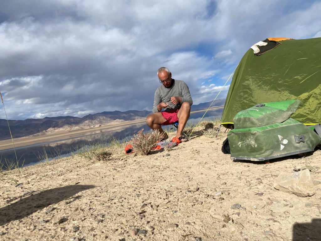 Je me mets ensuite au bricolage car j’ai cassé une des pattes du trépied qui me permet de me filmer. Et un trépied à deux pieds, ça ne tient pas debout ! Mon rafistolage n’est pas très convaincant et je me demande si je vais encore pouvoir l’utiliser. Vers 17h, le vent se lève, je décide donc de ne pas m’attarder. Je fais une popote lyophilisée, un yaourt et au lit. Il est à peine 18h quand je me glisse dans le duvet. Et je n’ai plus rien à lire puisque j’ai terminé mon bouquin hier soir et je l’ai laissé à l’hôtel Pamir. J’ai quand même téléchargé quelques ouvrages sur mon téléphone, mais le plaisir n’est pas le même.