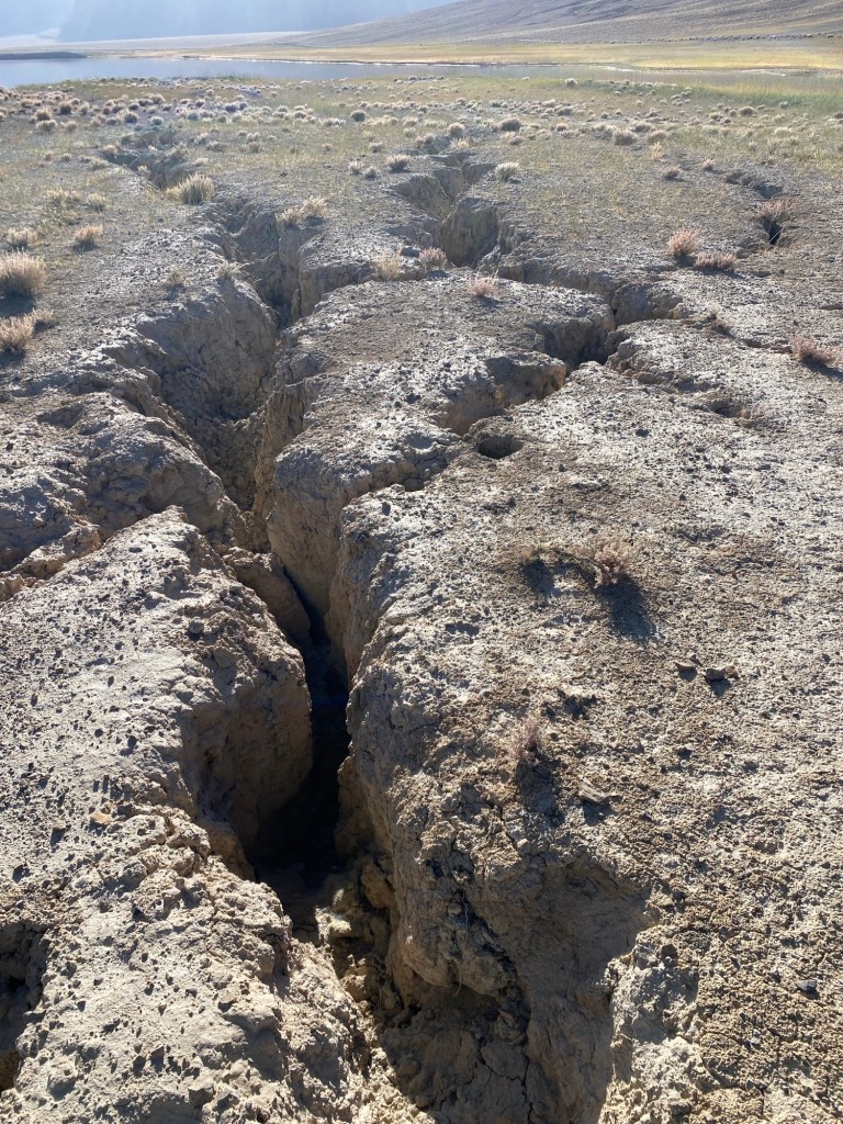 Je m’installe sur un petit promontoire qui domine le lac de quelques mètres. La terre est curieusement craquelée et marquée par des sortes de crevasses dont l’une nous sera fatale à Colibri et moi puisque on s’y effondre en voulant la traverser. Encore un petit bobo à la jambe qui va nécessiter un bon nettoyage et une désinfection. Pour le nettoyage, pas de soucis, l’eau du lac est là pour m’accueillir. Elle n’est d’ailleurs pas si froide et je suis tenté par un bain, mais je me contente d’une bonne toilette. J’apprécie au passage l’absence totale de vent, ce qui me change des jours précédents et qui renforce le silence autour du lac, à peine perturbé par les cris de rares oiseaux.