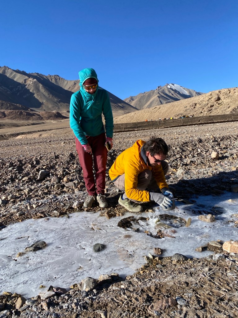 Au matin, comme d’habitude, le calme est revenu, le vent est tombé, et même si la température reste largement négative, bien couvert, c’est tout à fait supportable. Du coup on prend le temps de discuter pendant le petit déjeuner et de faire plus ample connaissance. Marion et Sébastien sont tous les deux médecins spécialistes à l’hôpital d’Annecy, elle gastro-entérologue, lui anesthésiste-réanimateur. Ils parviennent à cumuler des congés pour s’offrir quelques escapades cyclistes de temps en temps. Ils ont ainsi déjà fait une belle traversée de la Turquie au Népal. Ils voyagent en mode bike pack, c’est-à-dire très léger et le faible volume de leurs sacoches fait passer les miennes pour de grosses valises de soute.