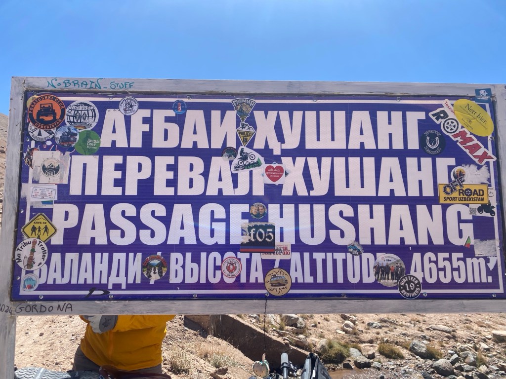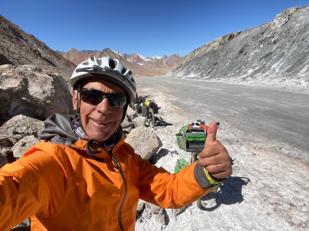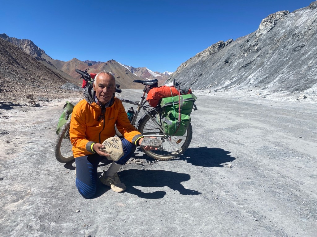 Je n’aurai guère de mérite à le faire car Ak Baital est ce que j’appellerais un col facile. Depuis notre point de bivouac, il ne reste plus que 300 m de dénivelé à grimper sur environ 5 km. Et comme le revêtement est tout à fait honnête, la véritable difficulté ne se présente que sur le tout dernier kilomètre marqué par quelques bosses bien senties. Malgré les bonbons au chocolat offerts par Daniel le berger, je suis contraint de faire plusieurs pauses pour faire baisser mon rythme cardiaque et retrouver mon souffle. Marion et Sébastien, arrivés en haut avant moi, m’encouragent pour les derniers hectomètres, accompagnés par deux Anglais survoltés qui m’offrent un sablé au chocolat à mon arrivée. Je l’ai fait, j’ai franchi mon Everest à moi, ce col qui me faisait fantasmer depuis des années.