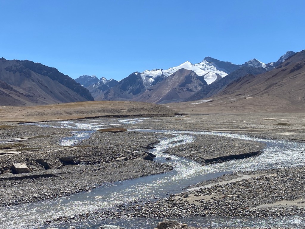 La descente à peine entamée, on tombe sur un couple de cyclistes qui termine l’ascension de l’autre côté. Les Québécois Agathe et Emmanuel sont en voyage de noces en Asie centrale et pas pressés de rentrer en France où ils vont s’installer après ce périple. On échange des informations sur le parcours, dont bien sûr l’état de la piste. Nous savons donc qu’une vingtaine de kilomètres de « planche à laver » nous attendent avant de retrouver de l’asphalte. Et c’est justement à ce changement de revêtement qu’on fait notre pause déjeuner dans les ruines d’une ancienne ferme qui nous abritent du vent qui se lève, comme chaque jour vers midi.