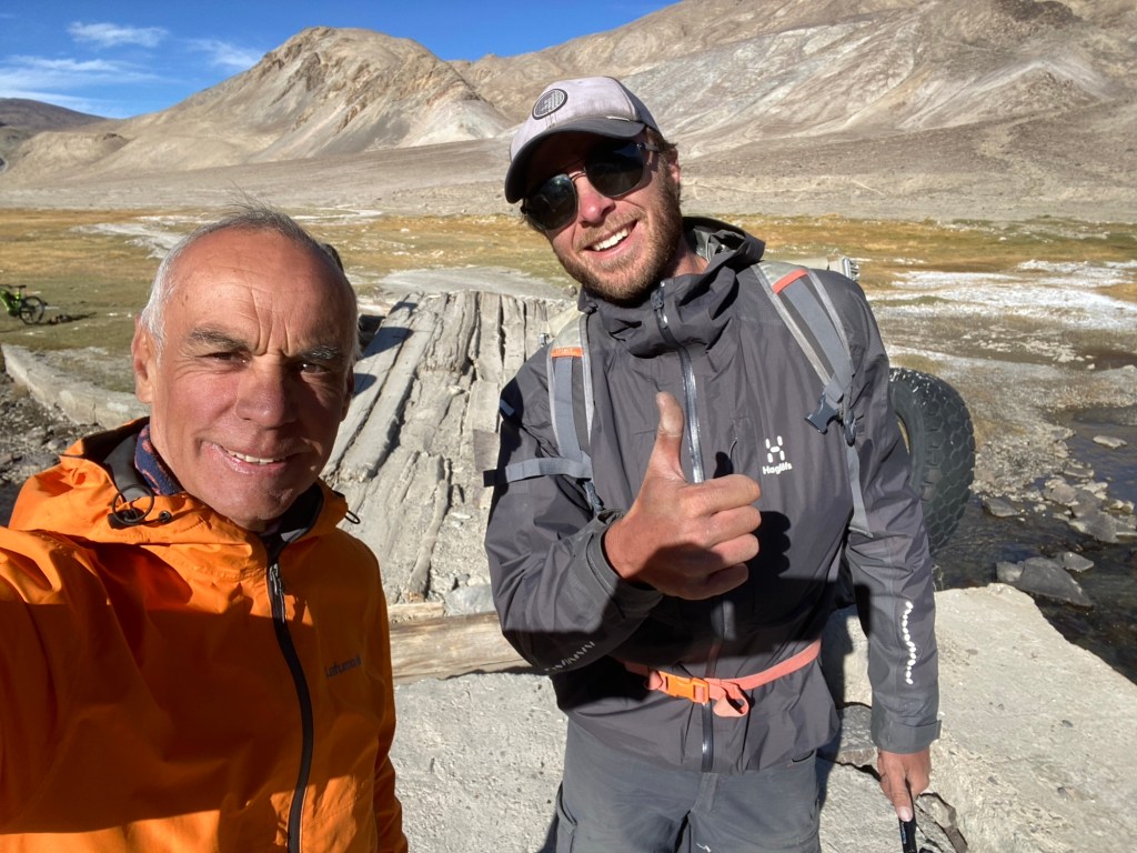 Un peu plus loin, nous trouvons effectivement le camp de yourtes, mais aussi un bel emplacement au bord d’une rivière qui me convient parfaitement. On y déjeune, puis je commence à m’y installer, tandis que Marco prépare des plans vidéo de la traversée du pont délabré qui se trouve juste à côté de mon emplacement.