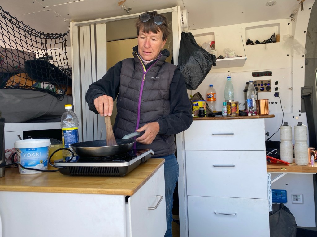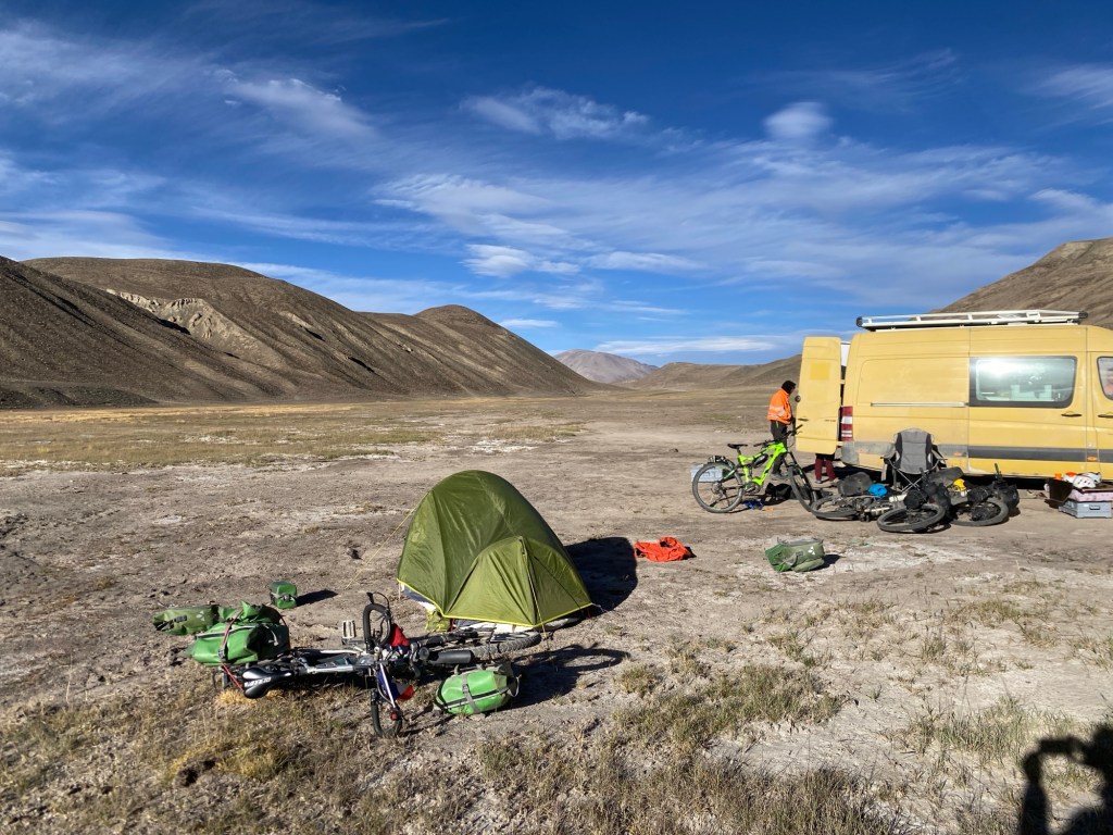 C’est alors que deux cyclistes passent et s’arrêtent pour discuter avec nous. Ce sont les propriétaires de la camionnette jaune, deux Allemands installés en France qui travaillent à distance, tout en voyageant en Asie centrale. Et, chose incroyable, ils ont « recueilli » Marion et Sébastien qui ont un problème de santé. Du coup, ils me proposent de venir bivouaquer à côté d’eux et de passer la soirée ensemble. Je remballe donc la tente que j’avais commencé à monter et je refais 2 km en arrière en compagnie de Jens, tandis que Marco poursuit son périple.