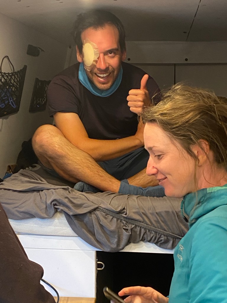 Nos deux jeunes médecins sont effectivement dans le van, Sébastien mal-en-point, à cause d’une mouche qui lui a déposé des larves dans l’œil. C’est une chose très rare, mais c’est la deuxième fois que cela lui arrive. Marion parvient à lui nettoyer l’œil avec du sérum physiologique et un coton-tige mais c’est très douloureux pour lui.