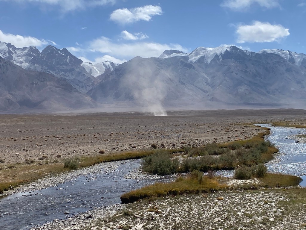 Je repasse sur le pont délabré où nous étions hier soir, mais je le franchis à pied car il me fait vraiment peur. Ensuite j’avance plutôt bien sur une piste correcte. Mais cela ne va pas durer ; le vent, qui se lève chaque jour vers midi, a choisi aujourd’hui de devancer l’appel et c’est dès 9h30 qu’il commence à me souffler dans le nez. Il va m’accompagner toute la journée au point de me rendre pénible une étape qui aurait pu être sympathique. Le pire est que j’ai beau changer de direction, il souffle toujours de face. À croire qu’il n’est là que pour empêcher ou ralentir ma progression. L’ami Eole a sorti toute sa panoplie et s’amuse à m’envoyer ses quatre vents à tour de rôle. Moi qui pensais faire une quarantaine de kilomètres en cinq heures, je roule généralement à 6km/h; c’est fatigant et déprimant. Du coup j’en viens à négliger le paysage autour de moi qui est, il est vrai, toujours aussi minéral et monotone, sauf les cimes enneigées du Damamat, 5.180 m. et du Kartash, 5.520 m. qui s’affichent en face de moi.