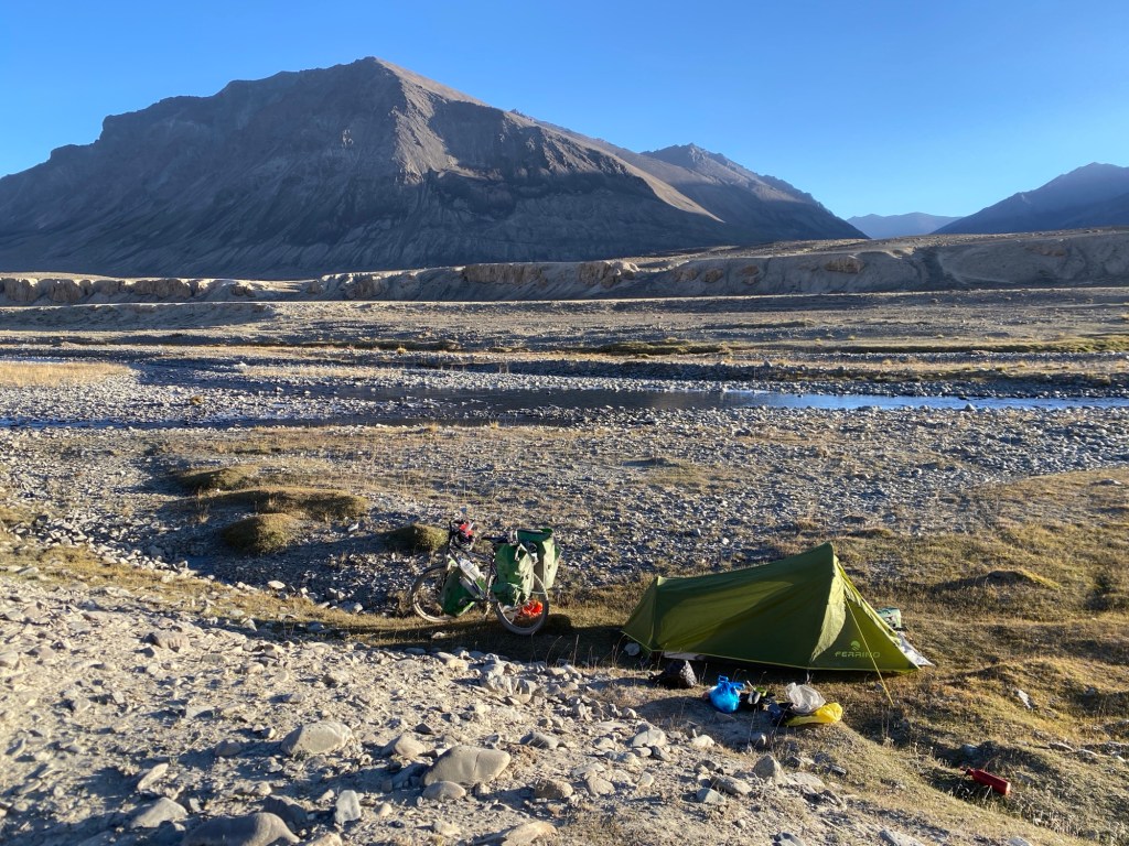Quand le compteur affiche enfin les 40 Km fatidiques, je pose le vélo et décide de ne plus bouger. L’endroit est moche au possible, il fait froid, le terrain est plein de cailloux, et je ne vois vraiment pas comment je vais monter une tente dans cet endroit en outre hyperventilé.