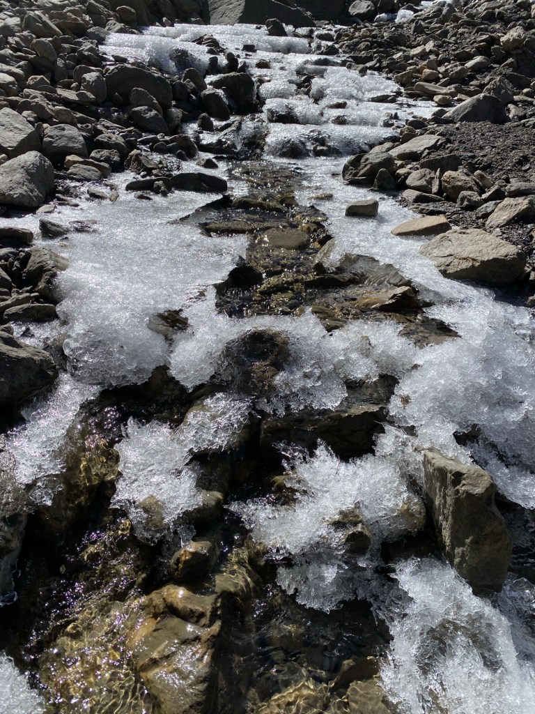 L’urgence est un bonne lessive car je n’ai plus rien de propre. En allant à la rivière, je remarque des petites traces d’animaux à deux ongles. Peut-être des mouflons qui descendent pour venir boire. La montagne porte en effet sur des versants très escarpés des traces bien marquées de passage d’animaux. J’aimerais bien en observer car, à part des marmottes et un lapin, je n’ai pas vu beaucoup d’animaux. Mais je crains que ma présence sur leur point d’eau ne les dissuadent de venir ce soir.