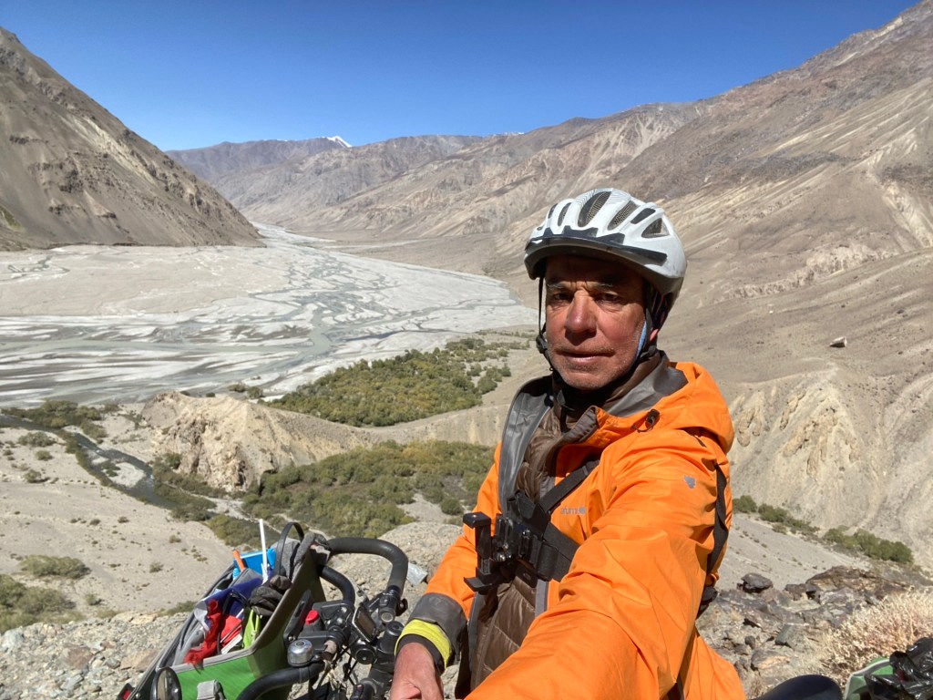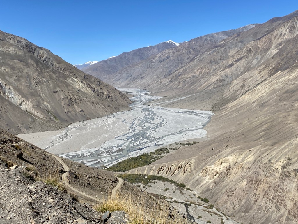 Après encore quelques petites côtes, j’arrive enfin au début de cette descente vertigineuse vers la vallée verdoyante que j’attends depuis hier. L’état de la piste ne me permet pas de descendre très vite ni d’admirer le paysage en roulant. Aussi fais-je de nombreux arrêts pour admirer la vallée en contrebas et la rivière Tanimas qui se sépare en une multitude de bras qui scintillent sous le soleil. Ce spectacle me réconcilie avec la vallée de Bartang qui m’avait déçu hier.