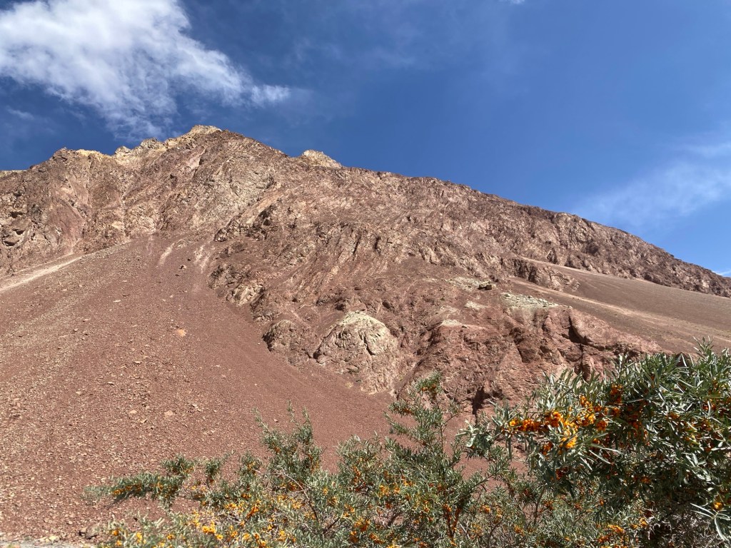 La suite est une succession de petites montées et de descentes en suivant le cours de la rivière dans une vallée qui se rétrécit peu à peu et devient spectaculaire. Les couleurs de la roche notamment sont exceptionnelles. Cela va du jaune au noir en passant par l’ocre et le rouge. Là encore, je m’arrête souvent pour faire des images, photos ou vidéos. La végétation change aussi, les plantes rabougries martyrisées par le vent laissent place à des arbustes qui forment des petits bosquets sur les rives.