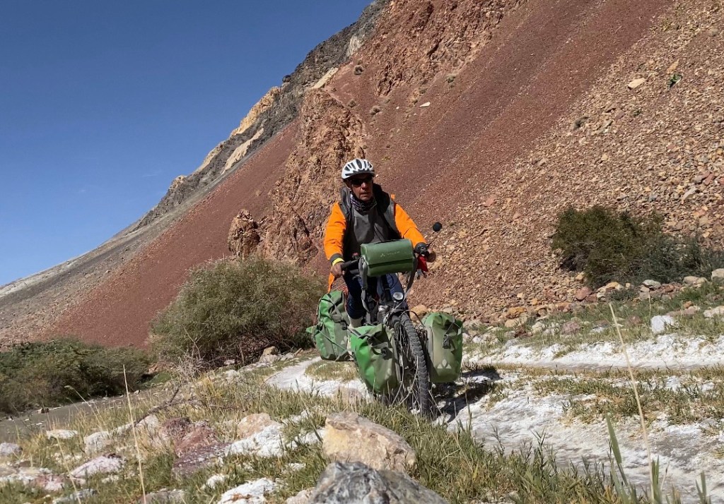Dans la nuit, j’ai dû rajouter une veste polaire à ma tenue, tellement il faisait froid. Levé à 5h30, j’attends avec impatience l’apparition du soleil qui apporte tout de suite quelques degrés supplémentaires. À peine ai-je fini de ranger mon matériel que je vois passer un cycliste sur la piste dans le sens contraire du mien. Comme il ne m’a pas vu, je le hèle vigoureusement pour qu’il s’arrête. C’est Benjamin, encore un Français, qui a tout quitté pour parcourir le monde à vélo, avec l’objectif d’aller en Asie du sud-est, puis en Australie pour travailler comme cuisinier et se refaire un peu d’argent. Avec mon petit tour du Tadjikistan, je me sens vraiment un tout petit voyageur.