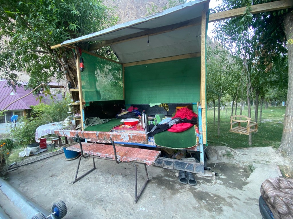 Quand mon compteur affiche les 60 kilomètres prévus, je ne cherche pas à faire de rab, juste à trouver un village, gage d’eau courante et de verdure. Ce sera Shipad, au kilomètre 62. Un grand type poivre et sel, sec comme un coup de trique, qui fauche de l’herbe, me salue chaleureusement; je lui demande où je peux planter ma tente, il m’indique son jardin, je pose Colibri sous les pommiers et je m’allonge dans l’herbe fraîche. Dix minutes plus tard, il vient me chercher et m’indique que je peux dormir sur son estrade munie d’un toit. Un montage de tente en moins, ça ne se refuse pas. Je remercie le monsieur qui s’appelle Murjno, je déroule mon duvet sur le tapis et me voilà prêt. C’est alors que le thé arrive, puis les tomates du jardin, puis le plat de pommes de terre à l’oignon, puis les délicieuses poires du jardin et les bonbons. Moi qui n’avait pas fait de vrai repas de la journée, je ne laisse pas une miette de toutes ces bonnes choses.