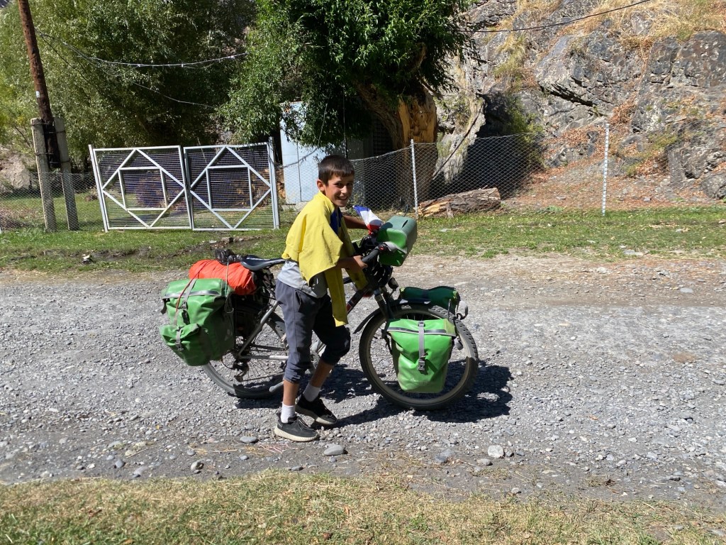 La rencontre avec deux jeunes cyclistes bavarois qui vont à Osch m’offre un instant de pause, mais je m’oblige à faire au moins la moitié de l’étape, soit 22 kilomètres avant de me reposer et casser la croûte, ce qui m’amène à la sortie du village de Bagu. A peine installé, je suis rejoint par un gamin d’une dizaine d’années qui s’installe à côté de moi. Je lui offre un gâteau sec, puis une pomme qu’il refuse car il en a chez lui et des bien plus grosses. D’ailleurs il m’invite à venir constater par moi-même. Ni une ni deux, je remballe mon déjeuner et me voilà installé chez Akim, dont la maman me sert un plat de viande pour au moins quatre personnes. Et le gamin est tout fier de me montrer ses pommes qui sont effectivement énormes. Il m’en donne plusieurs, ainsi que deux poires, les premières que je vois. C’est bien le signe que je suis revenu dans une zone tempérée où les fruits peuvent s’épanouir.