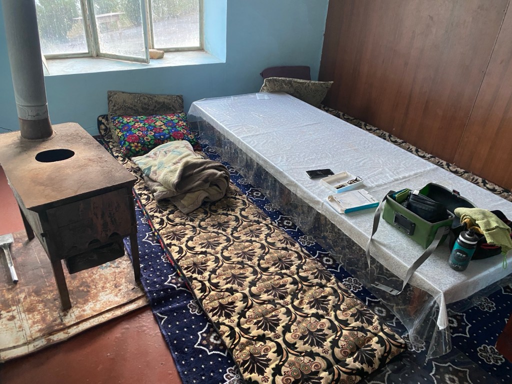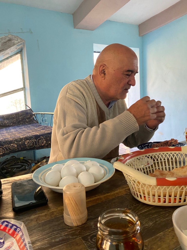 En fait, je me suis mépris ; je suis bien dans un hôtel, mais pas encore ouvert. Ce matin, je fais la connaissance du propriétaire des lieux, un géant au crâne rasé, ancien colonel de l’armée tadjike qui a cassé du taliban pendant la guerre civile. « Le Président me connaît », précise-t-il en me montrant fièrement sa photo en uniforme avec sa flopée de décorations. Désormais à la retraite il a investi dans ce futur hôtel qui est en construction depuis 9 ans et sera terminé… l’an prochain. Il est associé avec son frère qui vit à Moscou. « La Russie c’était bien avant au temps de l’URSS, maintenant, beurk ». En attendant d’ouvrir l’hôtel, il loue son terrain à une entreprise chinoise de travaux publics. J’ai l’honneur d’assister à son petit déjeuner, cinq œufs durs et un plat de viande de mouton dont il rouche les os dans un style très Cro-Magnon.