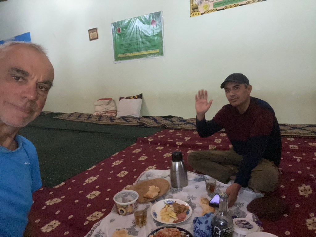 Dès la cérémonie terminée, on ressort les restes du repas d’hier soir et je me force à manger car j’aurai besoin de calories pour mener à bien la mission du jour, rallier Dushanbe, distante de 85 kilomètres et 1.500 mètres de dénivelé positif. Le fils de Mirzomeddin, reconnaissant des petits cadeaux que je lui ai offerts, vient me saluer à l’heure du départ. Il est 6h30, cela me laisse du temps avant que le soleil ne cogne trop fort.