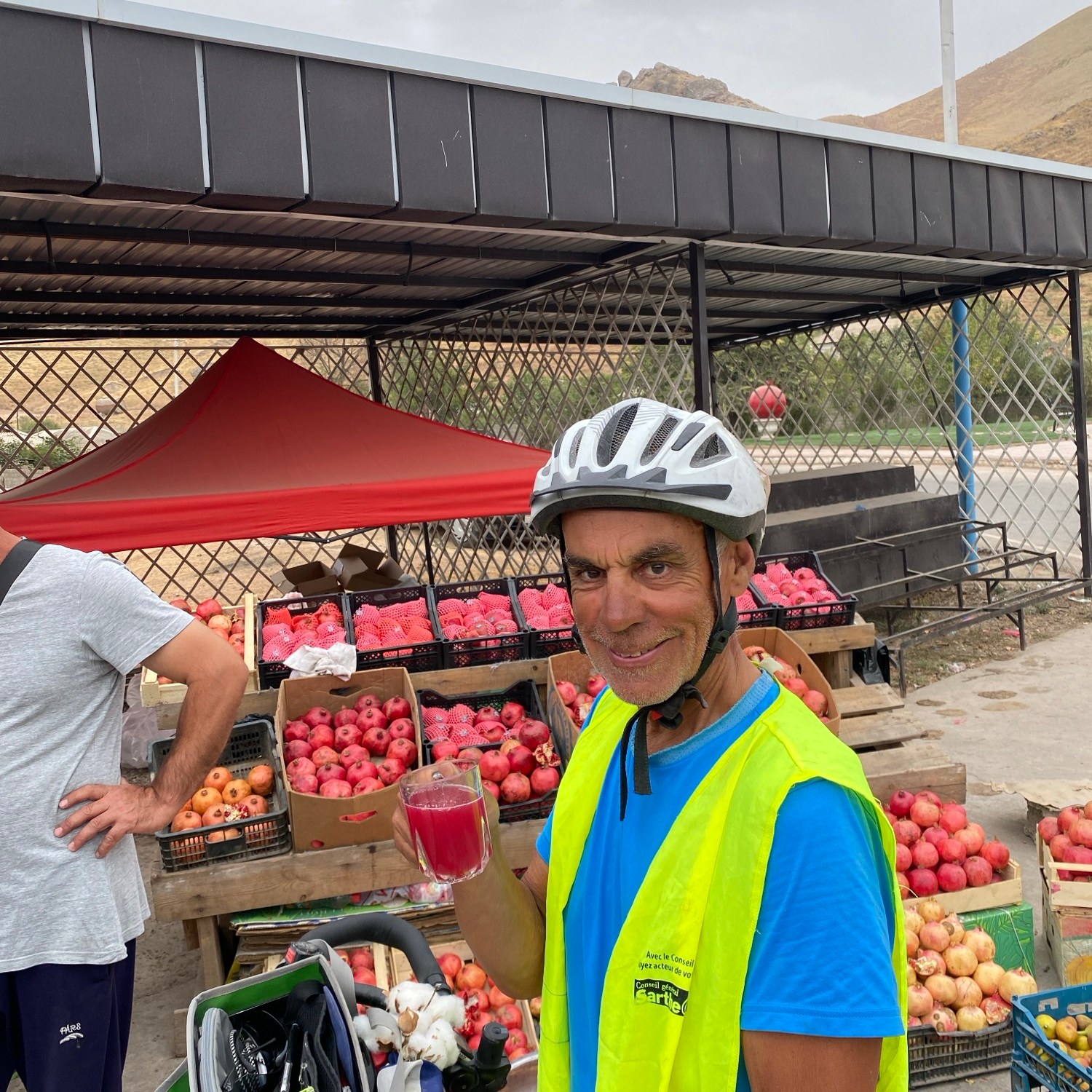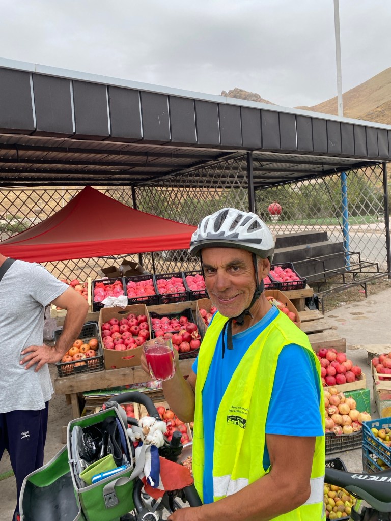 Une belle et longue descente m’amène à Karatosh où je traverse la rivière Vakhsh, avant d’aborder la deuxième difficulté du jour. La ville s’étant autoproclamée capitale de la grenade, je m’offre un jus de ce fruit pressé sur place et je m’achète une livre de délicieuses petites figues pour me donner du courage.