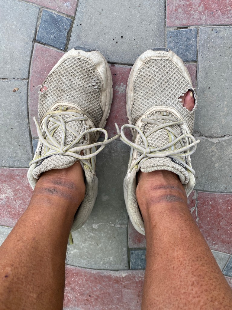 Le haut ça va mais le bas… Est-ce la première fois que tu reviens avec de tels pieds ? Impressionnant. Est-ce le frottement de tes baskets ? Tu as souvent réparé Colibri, maintenant place à la « réparation » de ton corps.