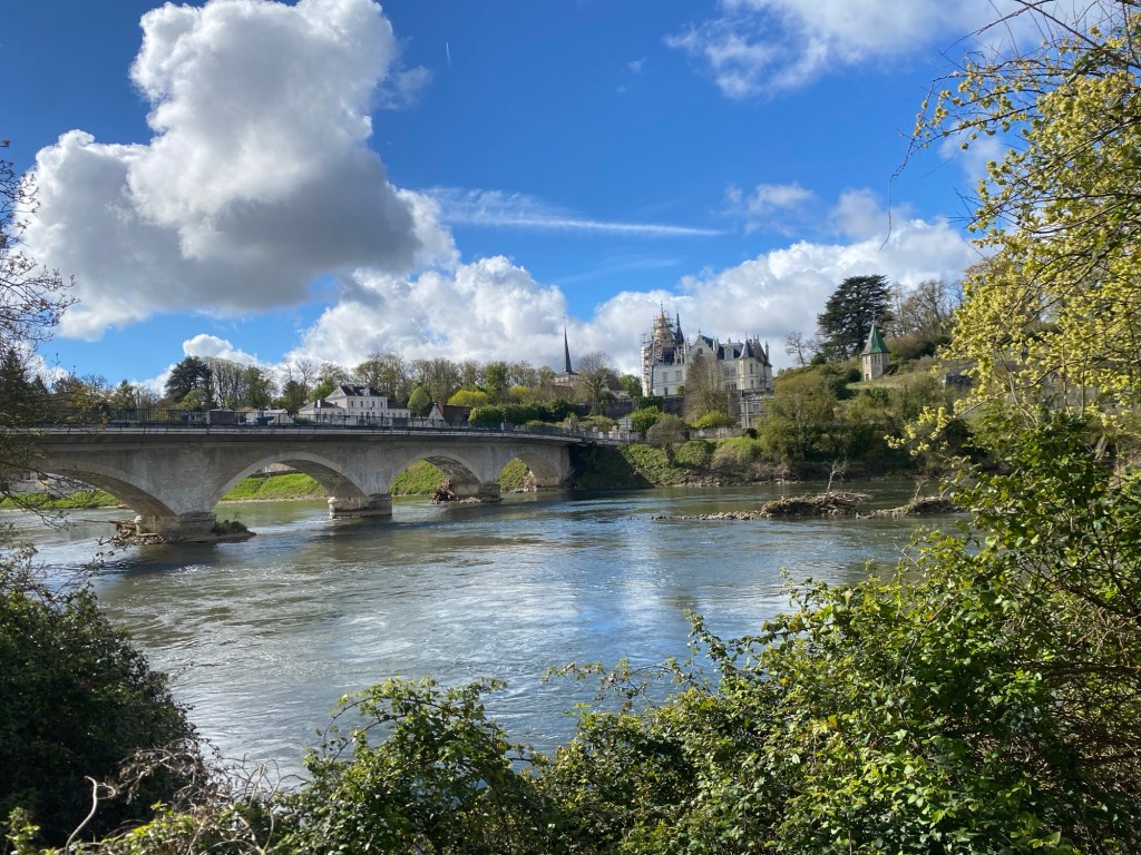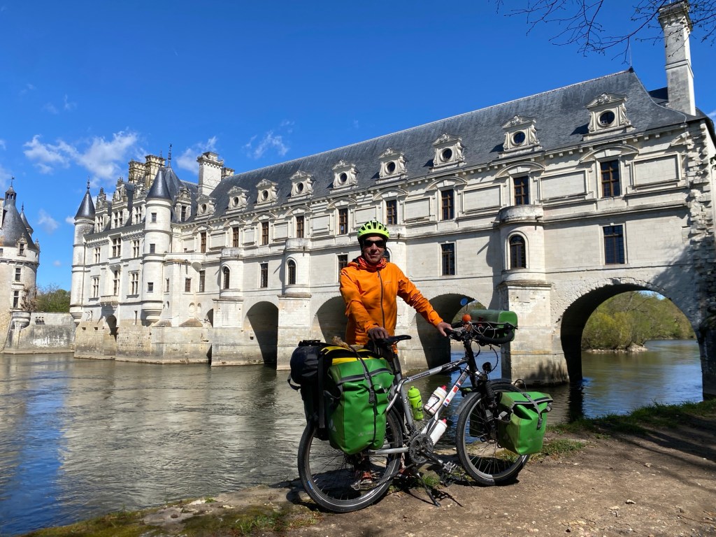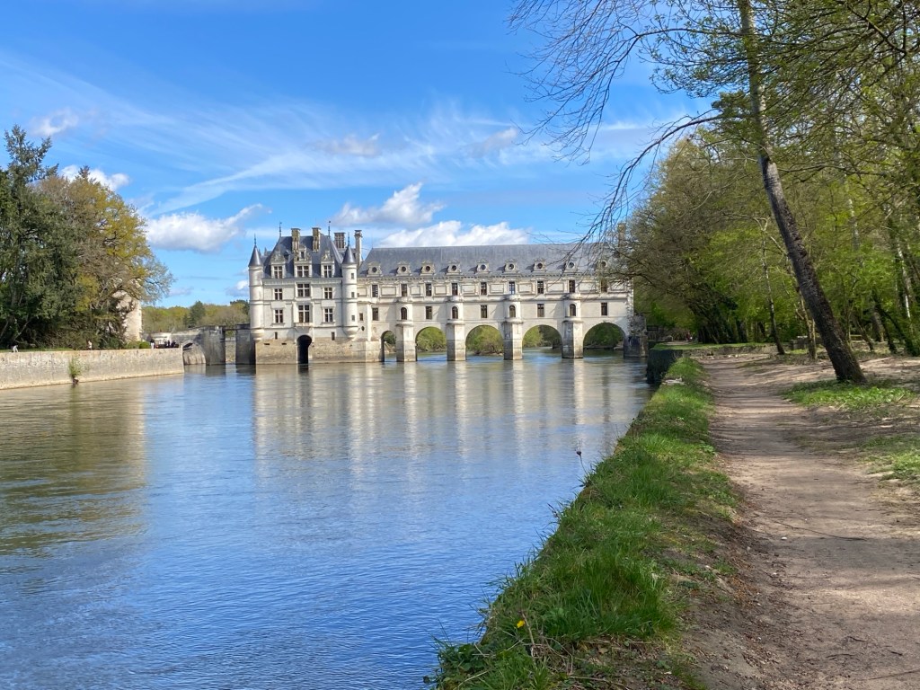 Apres Bléré, la piste cyclable qui longe le Cher se dégrade un peu. Mais ce petit désagrément est vite oublié quand je vois apparaître au loin la magnifique galerie du château de Chenonceau, qui enjambe la rivière. Pause photo obligatoire. Ce château est vraiment un de mes préférés car cette galerie sur l’eau lui donne un cachet particulier. J’aperçois des visiteurs qui flânent dans les jardins, mais aussi des promeneurs qui arpentent le chemin en profitant de cette vue exceptionnelle.