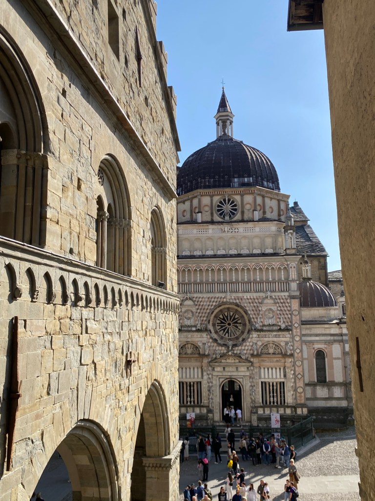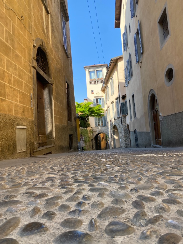 Content d’être en possession de tout mon matériel, je grimpe jusqu’à la ville haute de Bergame, un entrelacs de ruelles pavées bordées de boutiques à touristes, lesquels sont d’ailleurs si nombreux que j’ai du mal à me frayer un chemin parmi eux.