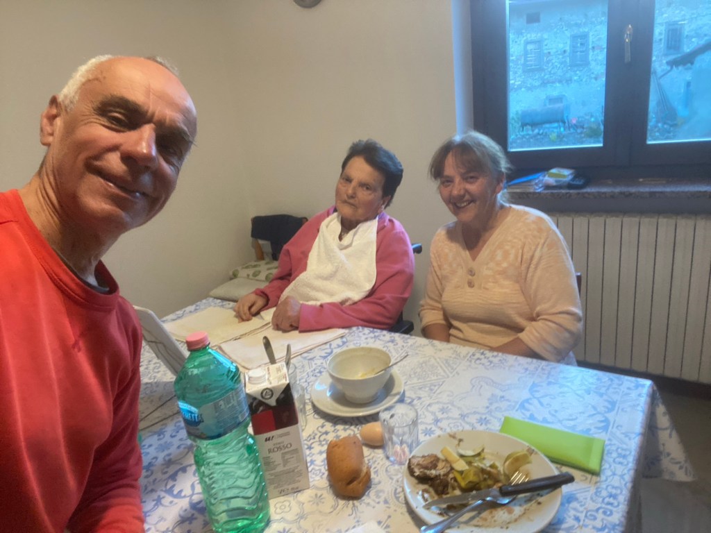 Juliana s’occupe à plein temps de sa maman Caterina qui est hémiplégique depuis 21 ans. Elle est aidée par un de ses frères qui habite le deuxième étage de la grande maison familiale. Je comprends que les deux autres frangins sont aux abonnés absents. À mesure que le repas avance, Juliana oublie que je suis étranger et me raconte l’histoire de sa vie dans un italien dont je ne saisis que des bribes. Je lui montre des photos de ma famille et aussi le tracé de mon périple qui la fascine car elle aimerait voyager.