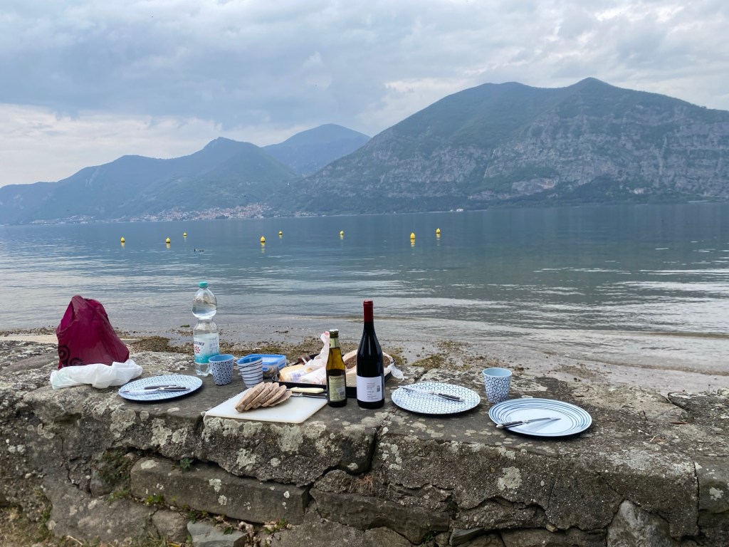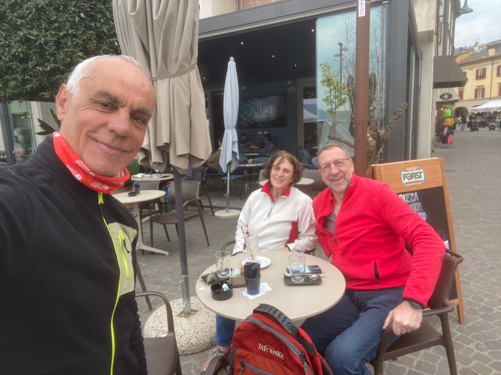 A 12h30, j’ai bouclé les 35 kilomètres et j’arrive dans la petite ville d’Iseo où il règne une atmosphère festive avec un marché qui fleure bon la gastronomie italienne. J’y retrouve mes amis allemands Heino et Evelyn qui viennent passer le mois d’avril dans le nord de l’Italie.