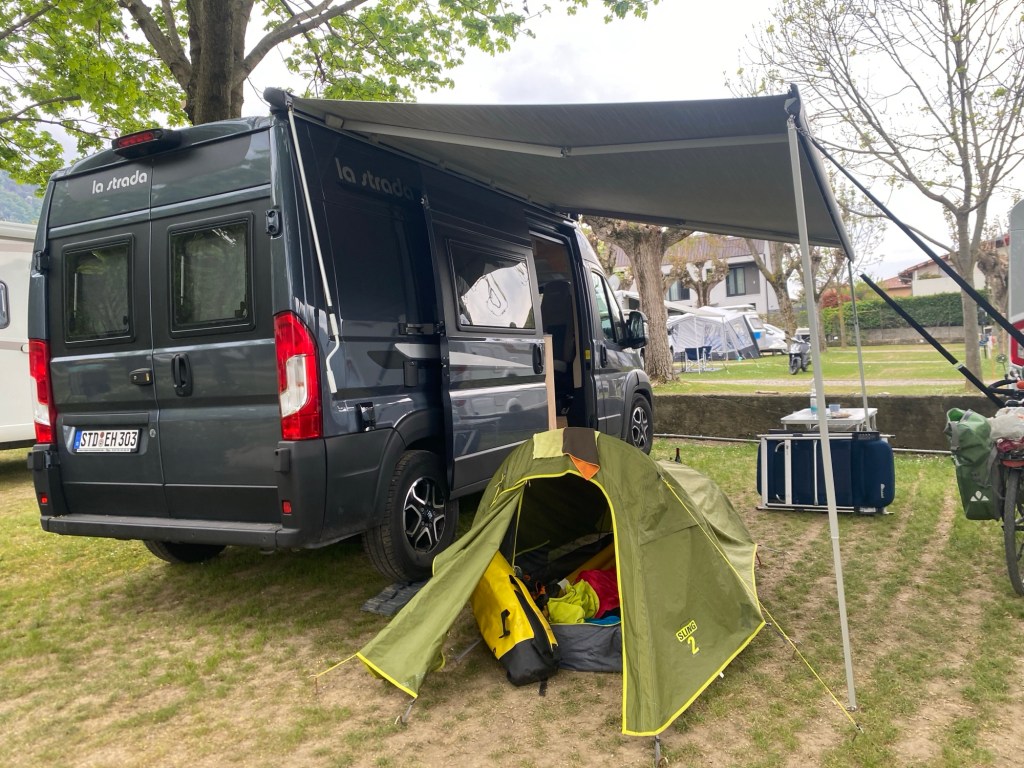 Après un pot en ville, je m’installe sur leur emplacement de camping, à l’abri sous l’auvent de leur camping-car. Même si la météo est tristoune, on s’installe sur le bord du lac pour manger, boire, échanger des nouvelles et refaire le monde. En soirée, un dîner au restaurant suivi d’une promenade le long du lac complètent cette vraie journée de repos.