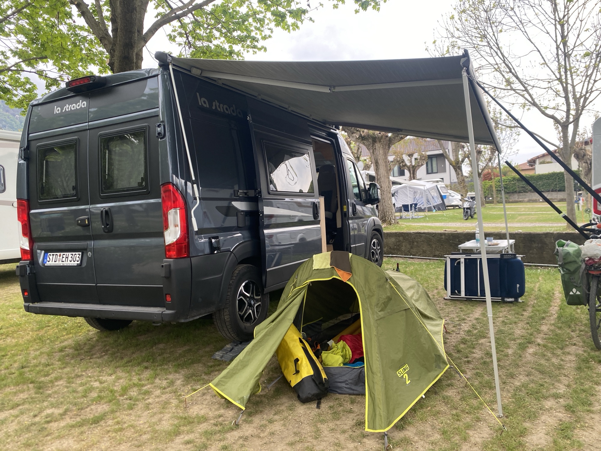 A 12h30, j’ai bouclé les 35 kilomètres et j’arrive dans la petite ville d’Iseo où il règne une atmosphère festive avec un marché qui fleure bon la gastronomie italienne. J’y retrouve mes amis allemands Heino et Evelyn qui viennent passer le mois d’avril dans le nord de l’Italie.